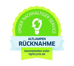 Wir bieten unseren gewerblichen Kunden nachhaltigen Rücknahmeservice und helfen gesetzliche Pflichten einfach zu erfüllen. Wie andere Elektro-Altgeräte müssen ausgediente LED- und Gasentladungslampen separat entsorgt werden. Der entsorgungspflichtige Besitzer dieser Altgeräte hat nach ElektroG II § 30 die Altgeräte dem Hersteller zu übergeben oder der „Stiftung ear“ die von ihm recycelten, verwerteten oder exportierten Altgeräte mitzuteilen. Damit Sie Ihre Pflichten ganz einfach erfüllen können, stellen wir mit Lightcycle über 400 Großmengensammelstellen zur Abgabe in Ihrer Nähe zur Verfügung. Hier können Sie ganz einfach Ihre Altlampen - ohne Mitteilungsaufwand an die „Stiftung ear“ - zurückbringen. So entsorgen Sie sicher sowie einfach und tragen damit bei, wertvolle Rohstoffe zu schonen, denn über 90 Prozent der Bestandteile von Altlampen können wiederverwertet werden. Für Mengen ab einer Tonne Altlampen bietet Lightcycle einen Abholservice an. Dieser Service gilt übrigens auch für Altleuchten. Ihre nächstgelegene Großmengensammelstelle finden Sie hier.